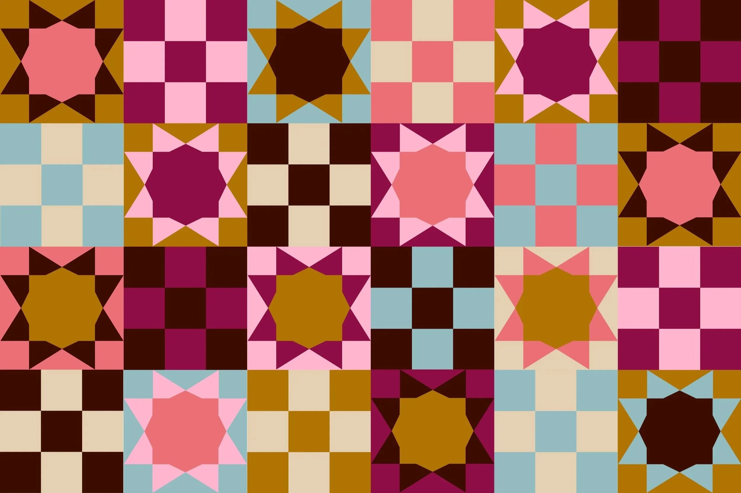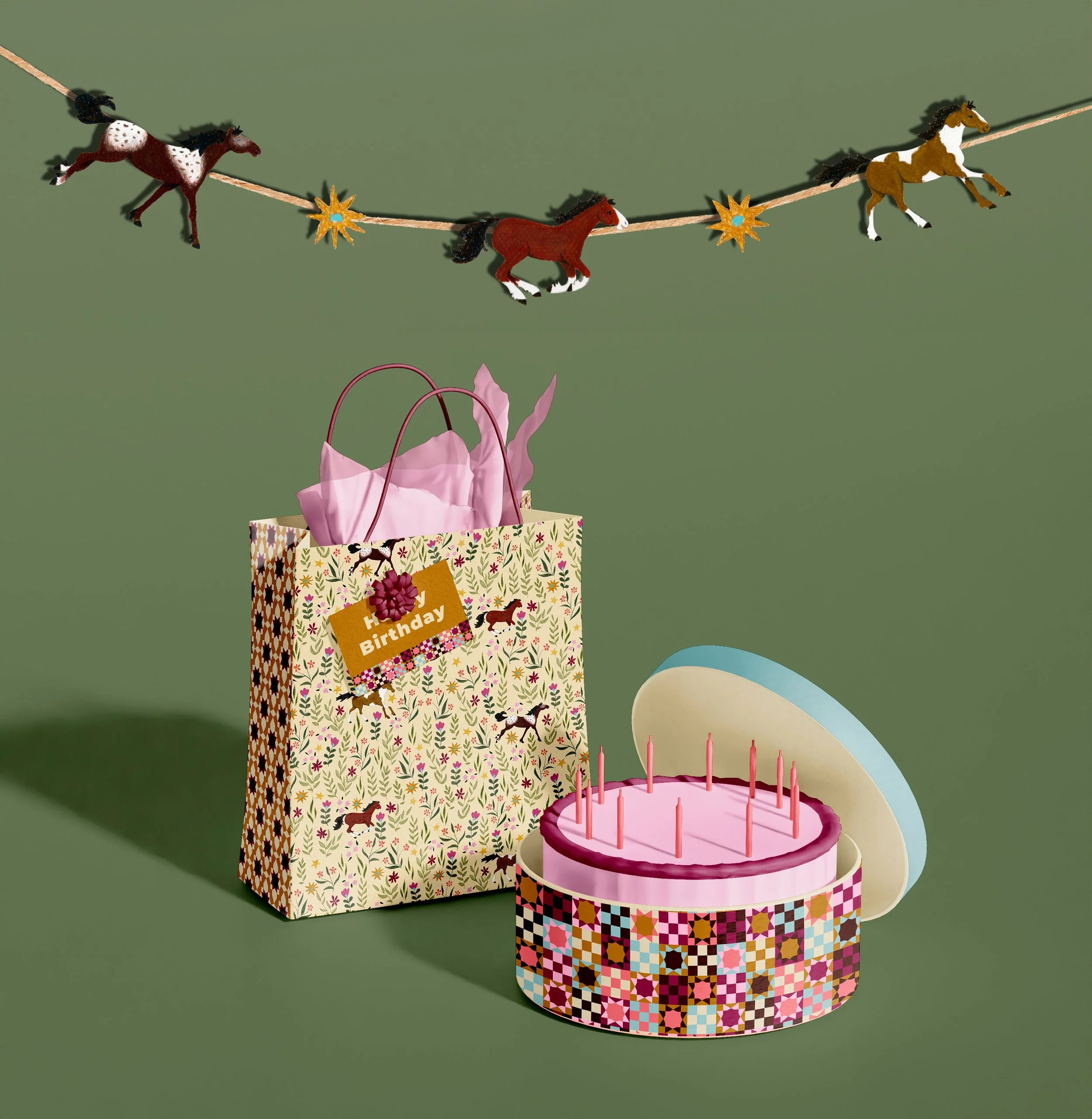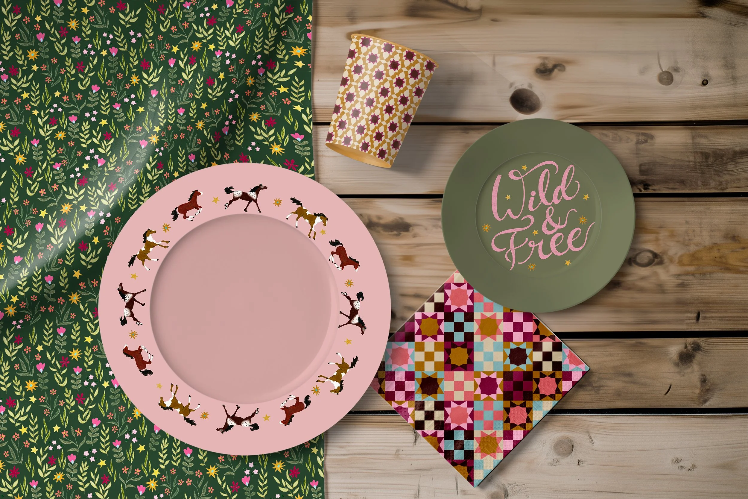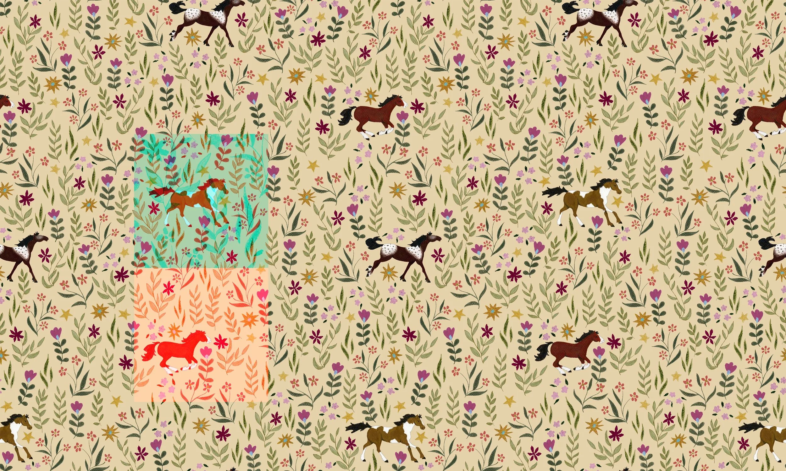 This pattern collection is inspired by country folk art and the Year of the Horse, celebrating freedom, movement, and youthful energy. Hand drawn in oil pastels and colored pencils, with hand lettered typography, this collection has a tactile, handmade feel.